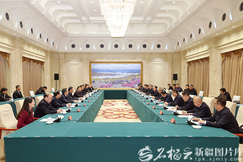 11月20日,自治区党委书记陈小江、自治区主席艾尔肯·吐尼亚孜在乌鲁木齐会见水利部党组书记、部长李国英一行。石榴云/新疆日报记者 崔志坚摄