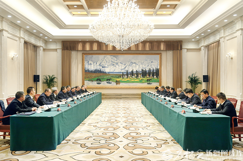 12月4日,自治区党委书记陈小江、自治区主席艾尔肯·吐尼亚孜在乌鲁木齐会见中国中铁股份有限公司董事长陈文健一行。石榴云/新疆日报记者 谢龙摄