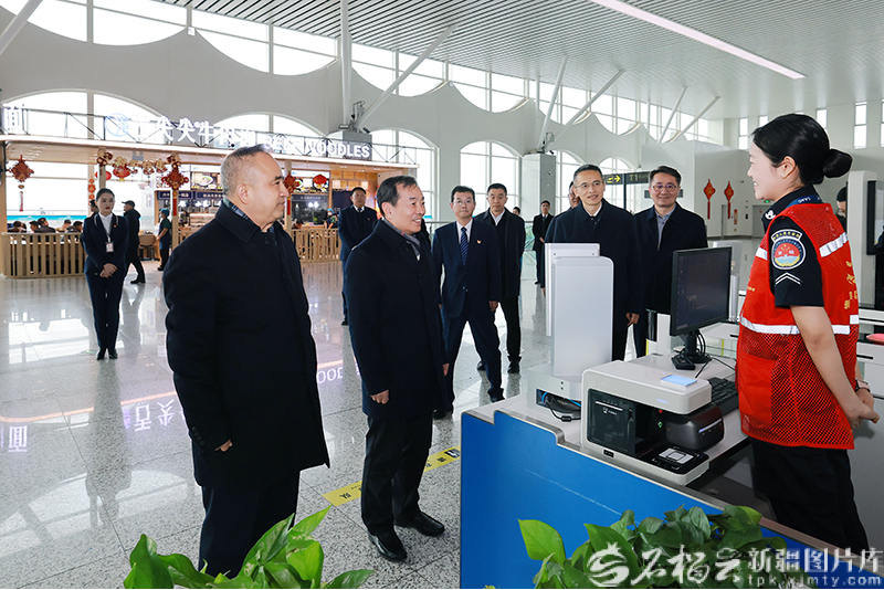 正值春运出行高峰,陈小江、艾尔肯·吐尼亚孜抵达喀什徕宁国际机场后,实地察看了群众出行情况,到管控中心听取春运组织和服务保障工作介绍。陈小江亲切看望各族职工,向大家祝贺新春。他说,春运一线职工用辛勤工作换来群众安全便捷出行,大家辛苦了。要加强运力统筹调度,努力提供温馨周到服务,切实加强安全管理,确保各族群众顺利出行、平安回家。