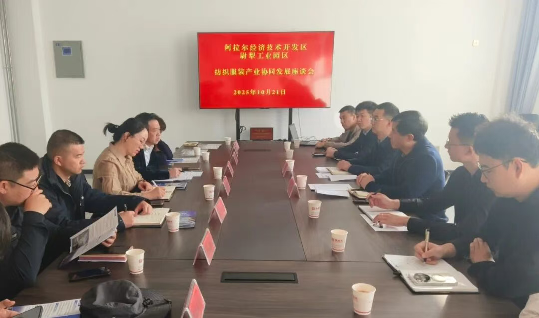 10月21日,阿拉尔经济技术开发区应尉犁工业园区之邀,联合举办了纺织服装产业协同发展座谈会,旨在搭建交流平台、共寻产业合作契机。尉犁工业园区党工委副书记、管委会主任刘伟光,阿拉尔经开区招商局局长黎江成,以及两地相关部门负责人、企业代表共同参会。