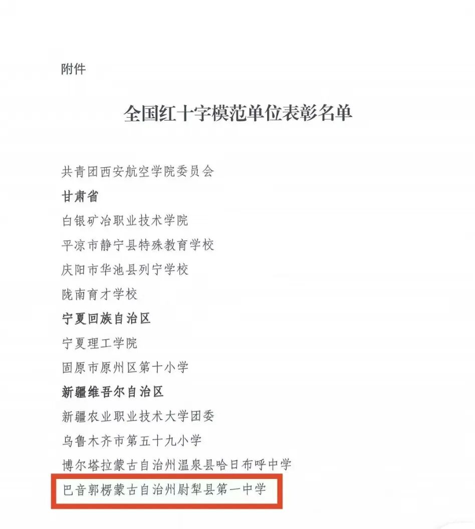 为表彰先进,充分调动社会各界广泛参与和支持红十字事业,形成促进红十字事业发展的合力,中国红十字会总会决定,授予99个城乡社区、99个学校、100个红十字志愿服务组织、52个机关企事业单位和19个冠名红十字医疗机构“全国红十字模范单位”称号。祝贺尉犁县第一中学荣获“全国红十字模范单位”荣誉,为县一中点赞。