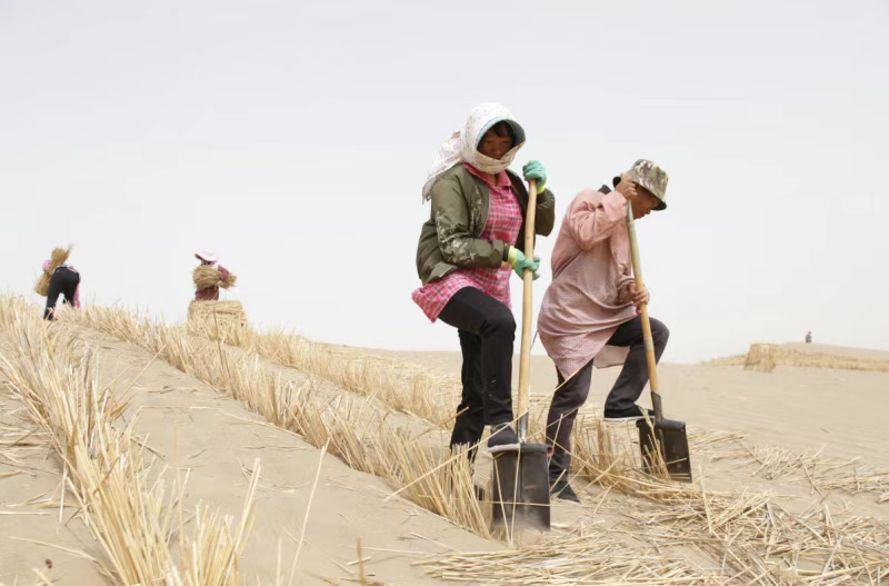 固沙阶段,400余名工人历时700多天,以手工扎设5800多万平方米草方格,相当于1.8个澳门特别行政区陆地面积。这些被外国人称为“中国魔方”的草方格,在大漠中形成绵延300多公里的防沙固沙屏障。公路两侧还种植了120万株梭梭、沙棘,在瀚海开辟出通途,筑起一道绿色屏障。