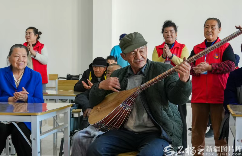 12月3日,尉犁县中心敬老院的活动室里,冬日暖阳透过新装的窗帘铺满每一个角落。塔里木乡塔里木村村民奥斯曼·约麦尔怀抱都塔尔端坐着,手指拨弦,旋律动人。工作人员与老人们围坐一圈,跟着节奏轻声哼唱。
