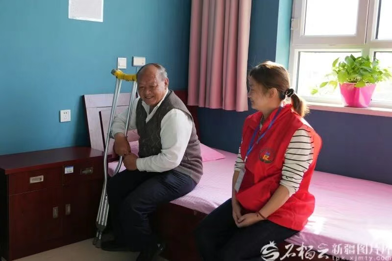 12月3日,尉犁县中心敬老院,工作人员和老人拉家常。汪志鹏摄