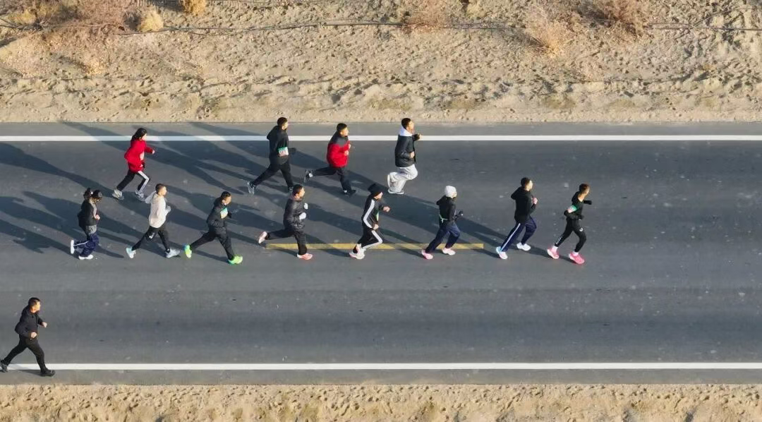 赛事按照年龄段分为35周岁以下和35周岁以上两组,要求3人一组共同完赛,既考验体能与耐力,又强调协作与默契。来自各地的参赛队伍既有各族选手的并肩作战,也有亲友、同事的跨界组合,大家踏沙竞逐,用脚步丈量大漠冬韵,在赛道上相互鼓励、携手前行,尽显民族团结一家亲的深厚情谊。