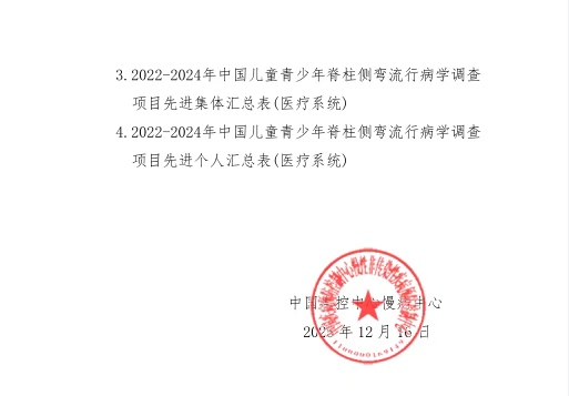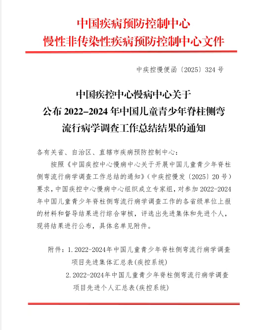 近日,国家疾病预防控制中心慢性非传染性疾病预防控制中心发布了《2022-2024年中国儿童青少年脊柱侧弯流行病学调查工作总结结果的通知》,对在全国范围内参与此项重大公共卫生项目的单位与个人进行表彰。