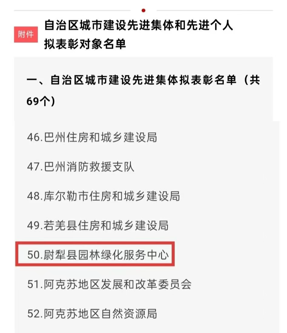 根据自治区人民政府办公厅《关于开展新疆维吾尔自治区城市建设先进集体和先进个人评比表彰工作的通知》(新政办发〔2025〕36号)要求,按照评比表彰工作安排,经自治区部门单位和各地(州、市)自下而上、层层推选、好中选优,并报自治区功勋荣誉表彰工作领导小组同意,拟表彰自治区城市建设先进集体69个、先进个人75名(名单附后)。其中,尉犁县园林绿化服务中心凭借在城市建设领域的扎实工作与突出成效,成功入选自治区城市建设先进集体拟表彰名单!