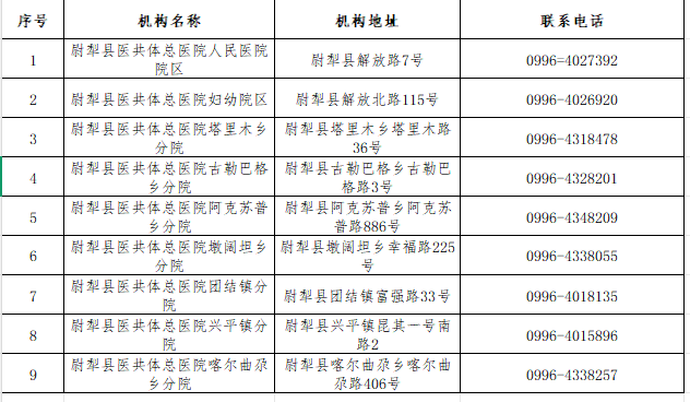 按年龄段及人群分类安排至指定机构,均为尉犁县医共体总医院各院区及各乡镇分院: