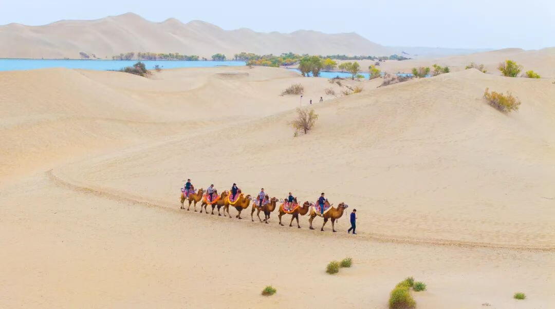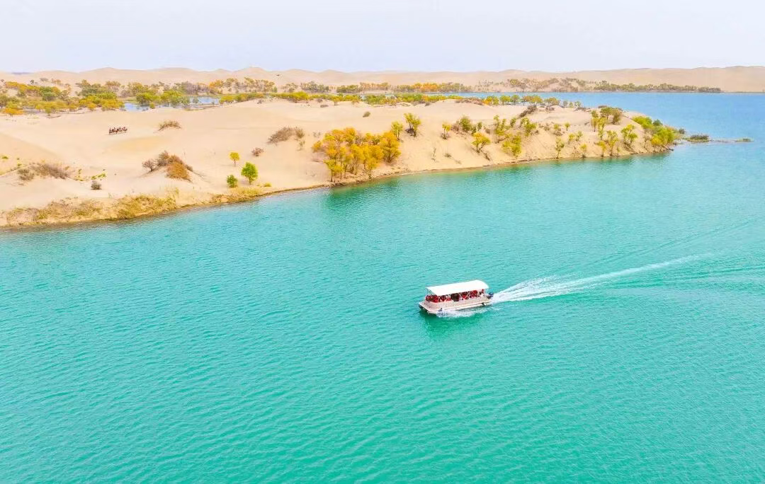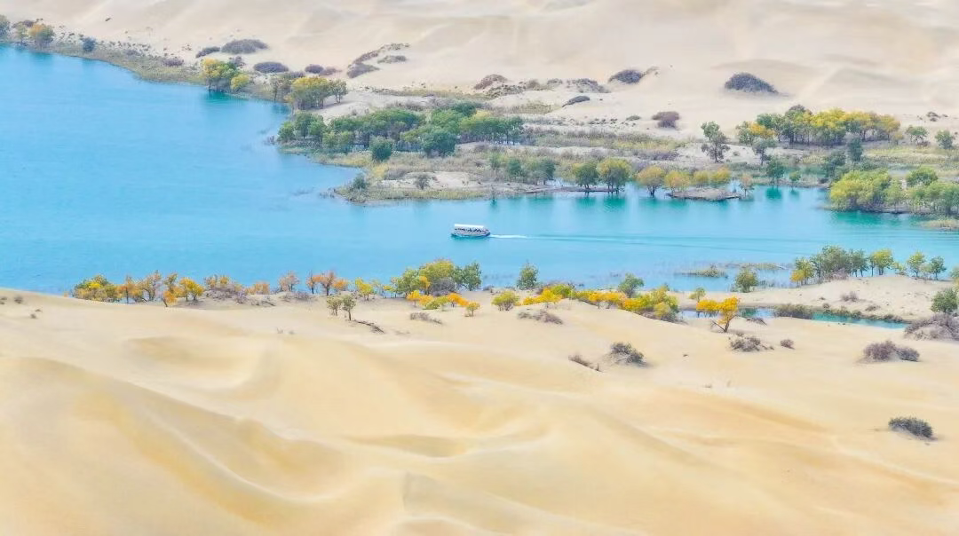 10月8日,位于塔克拉玛干沙漠中的新疆巴音郭楞蒙古自治州尉犁县罗布湖风光旖旎,泛黄的胡杨、湛蓝的湖水、金色的沙丘,共同绘就了一幅山水画卷;游客们乘船游览,沉浸式感受着沙漠湖泊呈现出的秋日美景。