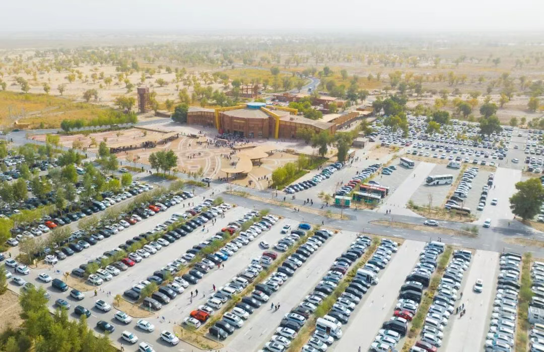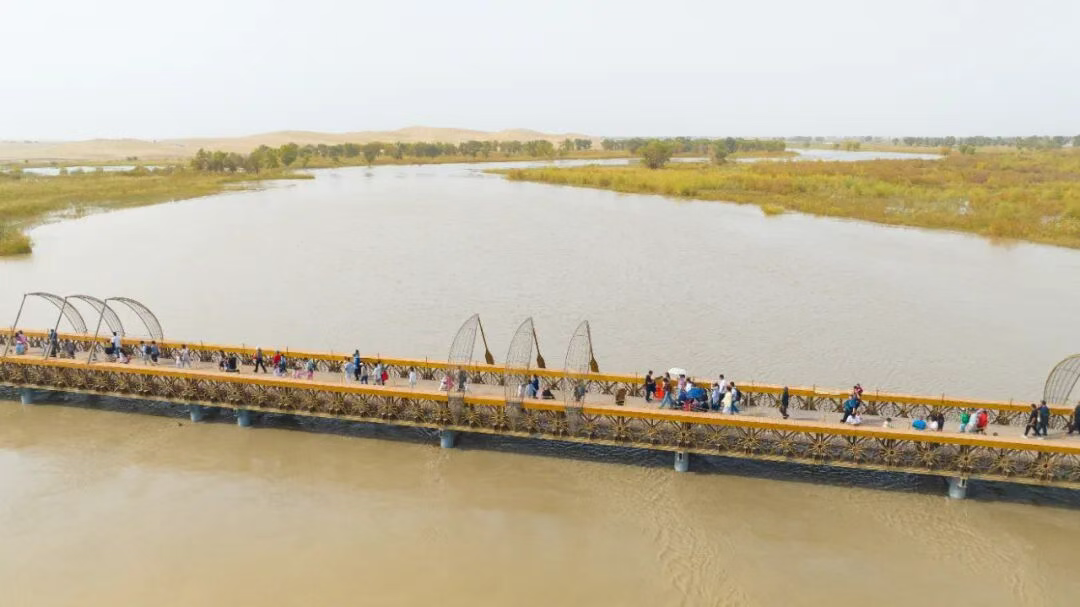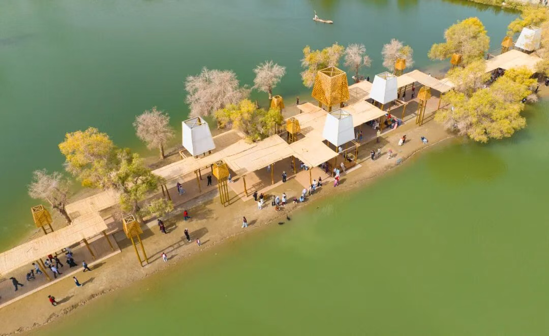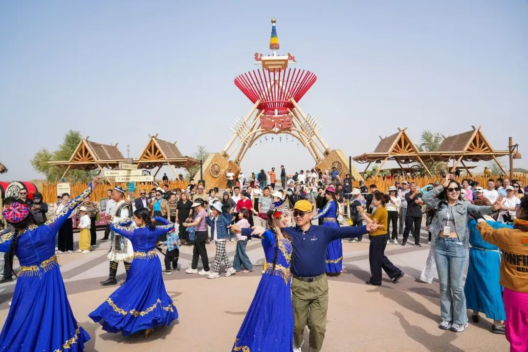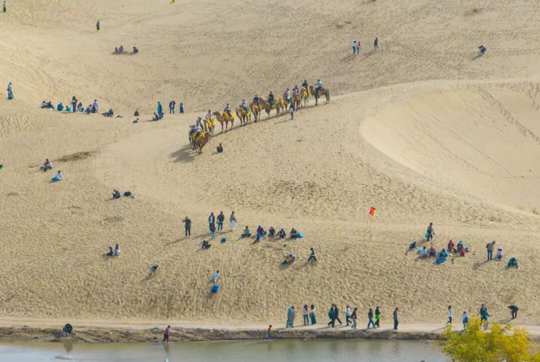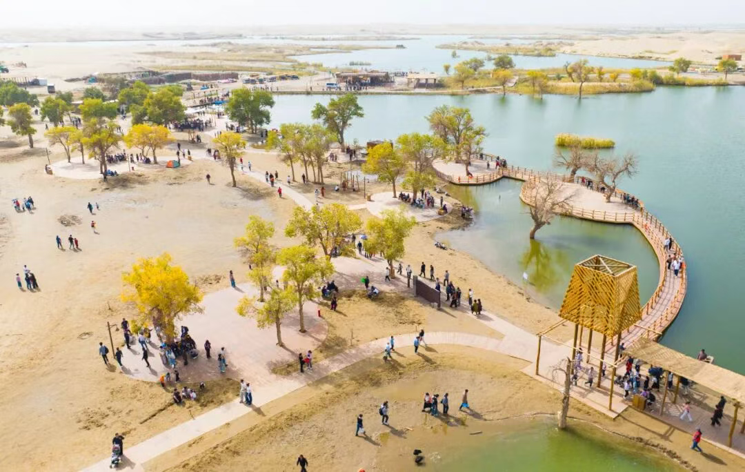 2025年10月3日,在新疆巴音郭楞蒙古自治州尉犁县罗布人村寨景区,游客们在大漠、绿洲、湖泊的美景中畅游,骆驼骑行、沙漠越野、划船、滑沙成为不少游客的首选,尽享秋日美景。