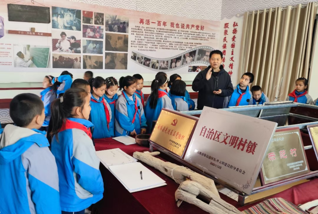 随后,白永敏带领学生们走进塔里木乡库木库勒村的塔力甫·艾山爱国主义教育基地,讲述了塔力甫·艾山老人的爱国事迹,在历史与现实的交融中为孩子们带来一场深刻的红色精神洗礼。展厅内,那台破旧的“雪莲”牌收音机、一枚枚承载荣誉的奖章,以及老人一生使用过的木犁子等实物展品,无声诉说着他的赤胆忠心与深厚爱国情怀。“这块边缘破损的小黑板,不仅是村民了解党的政策、认识外面世界的窗口,更成为跨越民族的‘连心桥’,传递着团结与和谐的强音。”白永敏恳切寄语:“塔里甫爷爷用一生践行爱国信念,你们也要把这份精神铭记于心、代代相传,做有理想、有担当、爱祖国的新时代好少年。”孩子们神情庄重,认真聆听。