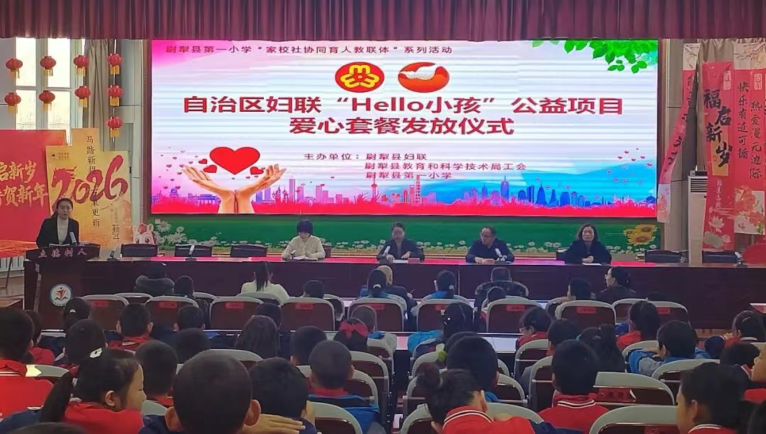 1月15日,尉犁县第一小学和第八小学内温情涌动、暖意融融,县妇联在此举办自治区妇联“HELLO小孩”公益项目爱心套餐发放暨家风育人主题活动,为两所学校的500名学生发放学习生活爱心物资。