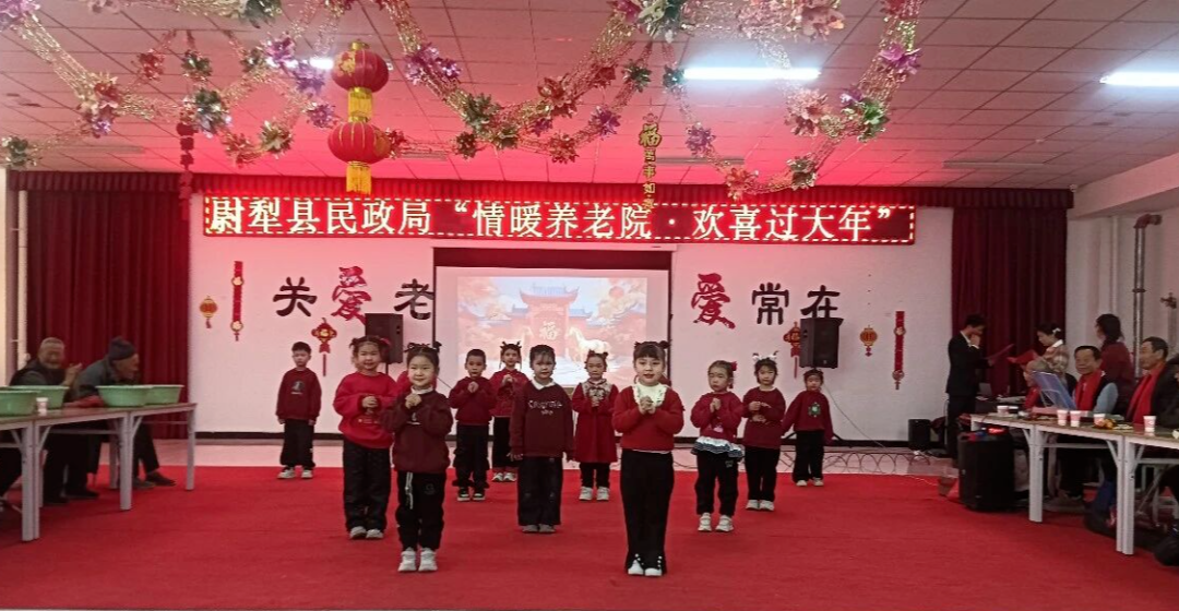 活动前期,县民政局精准对接“一老一小”需求,兼顾老人观赏喜好与儿童参与特点,联动多方细化节目编排、礼品筹备、现场保障等工作,确保活动安全贴合需求。联欢会伊始,县民政局党组书记致辞,向老人送上新春祝福,肯定养老院工作人员履职成效,寄语托育中心、未保站的孩子们传承敬老爱老美德。