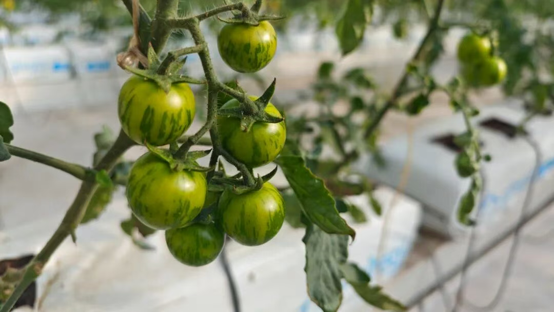 与生菜比邻而居的,是采用无土栽培技术的小番茄。作物扎根于由椰壳配制的营养基质中,一串串果实挂满藤蔓,色泽饱满。在这片硕果累累的大棚内,却不见人工管理的繁忙景象,取而代之的是温室入口处高效运转的智能水肥一体机,以及棚顶负责数据传输的线路。这些设备如同敏锐的“神经系统”,实时监测并自动调控着棚内的温度、湿度、通风、含水量及营养值等关键参数,确保作物始终处于最佳生长环境。