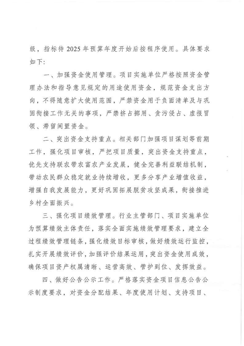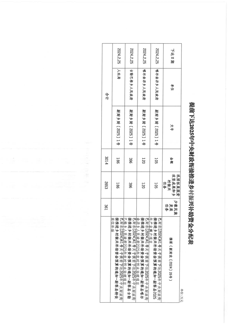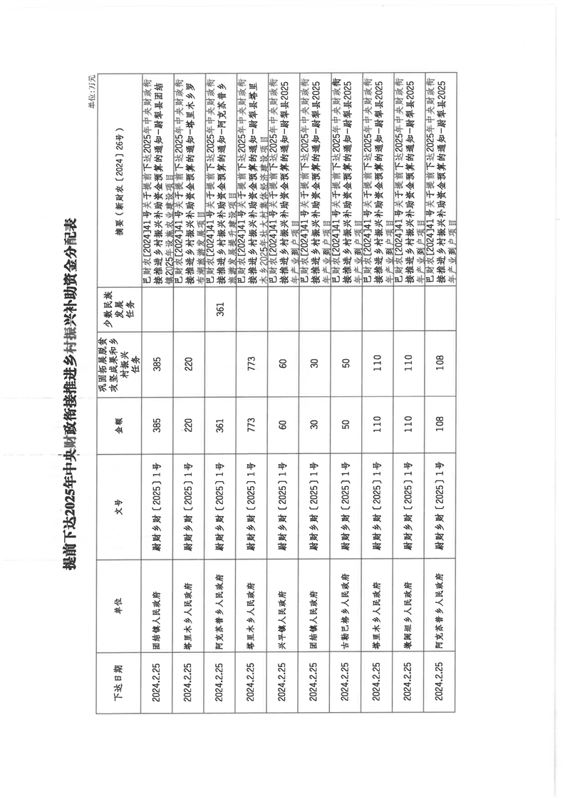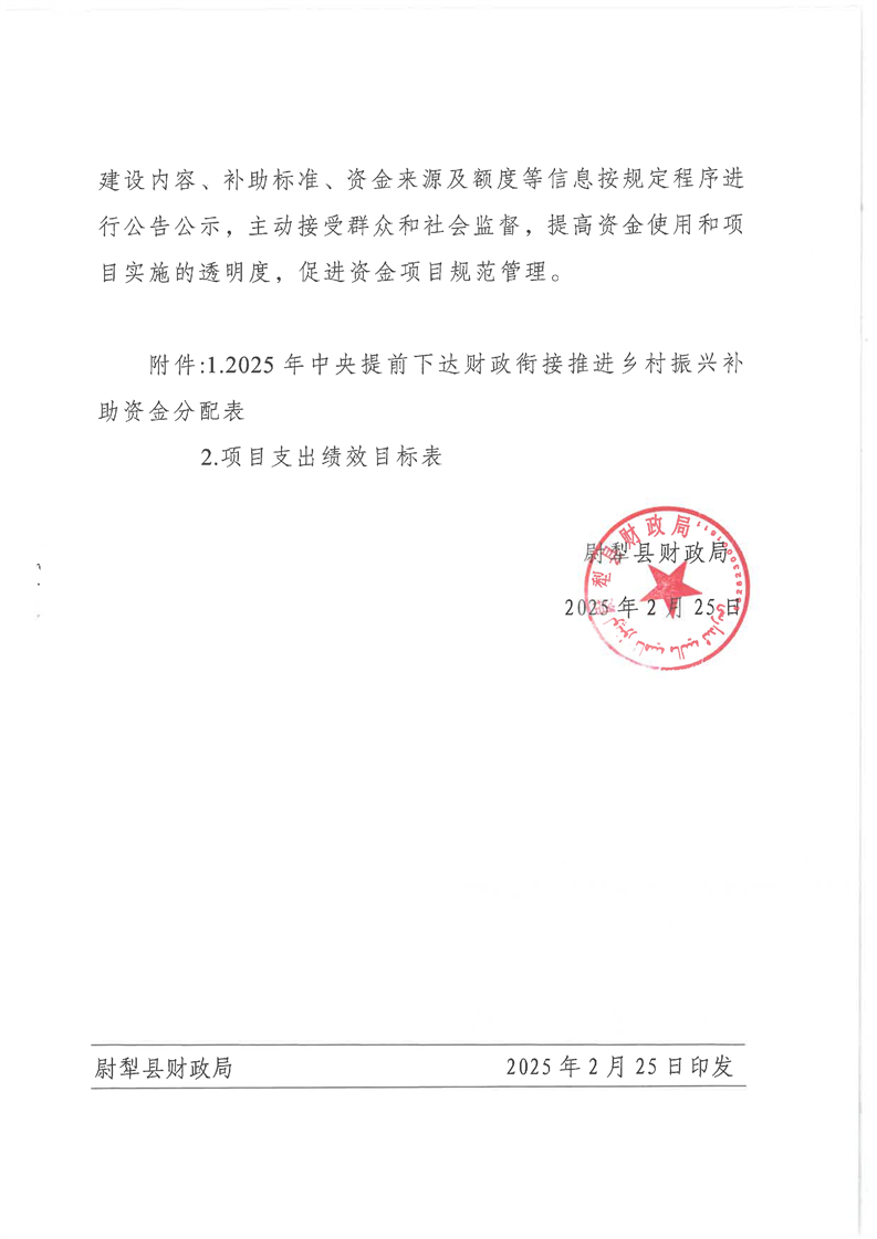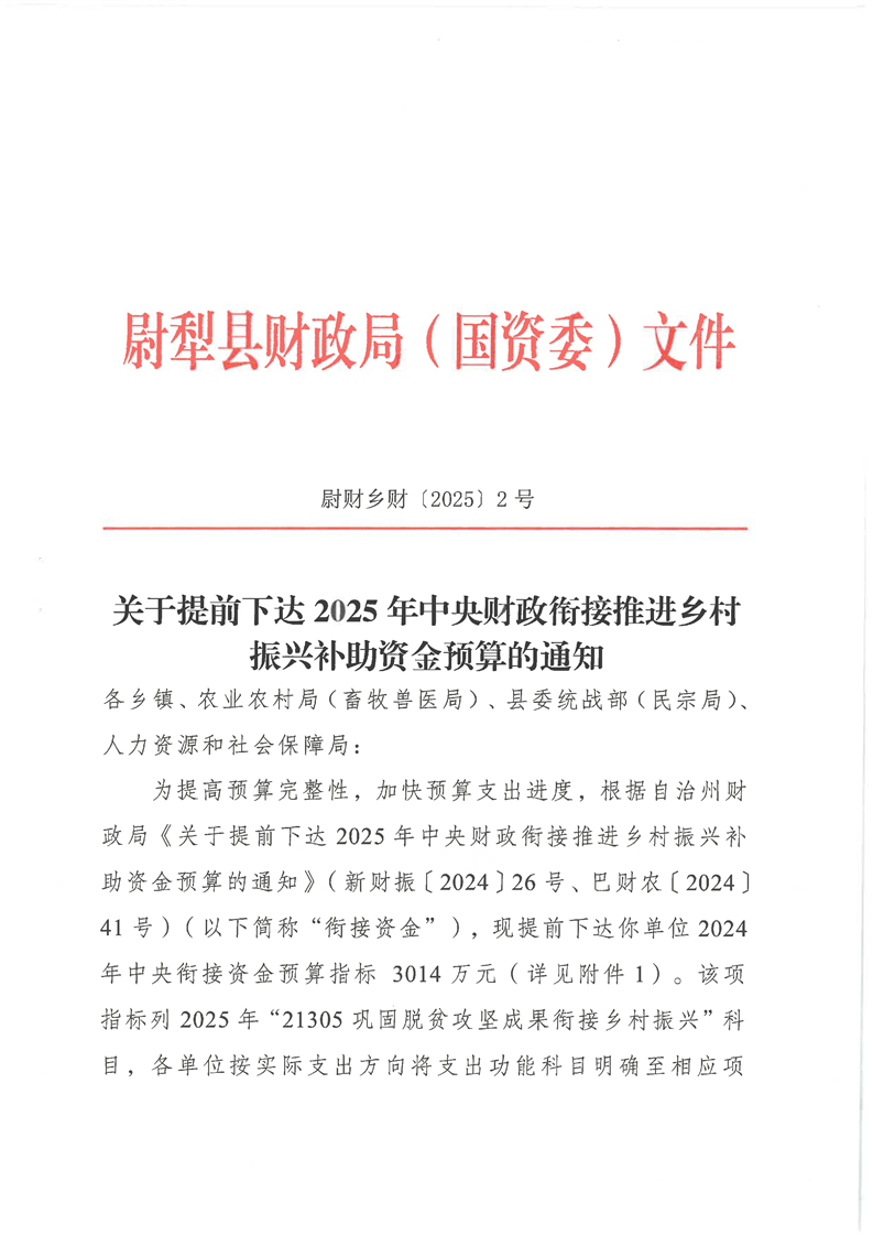 尉财乡财〔2025〕2号关于提前下达2025年中央财政衔接推进乡村振兴补助资金预算的通知