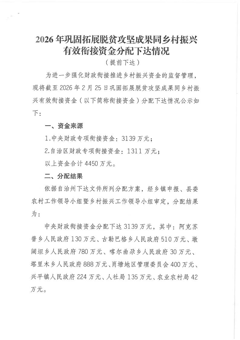 2026年巩固拓展脱贫攻坚成果同乡村振兴有效衔接资金分配下达情况