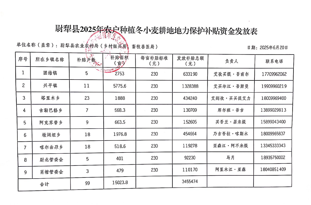 尉犁县2025年农户种植冬小麦耕地地力保护补贴资金发放表