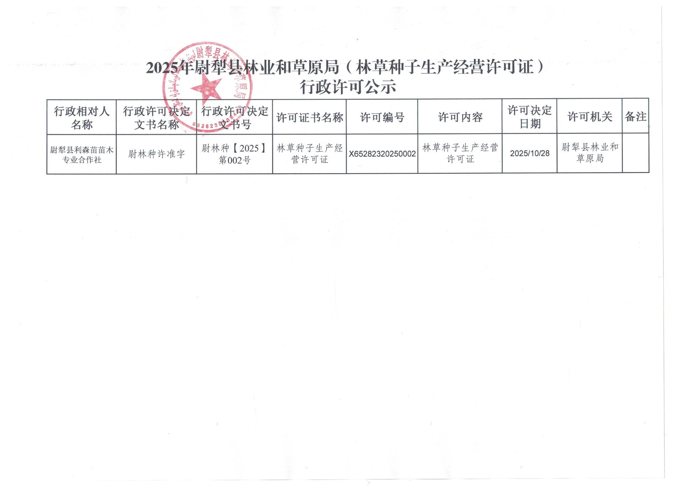 2025年尉犁县林业和草原局(林草种子生产经营许可证)行政许可公示