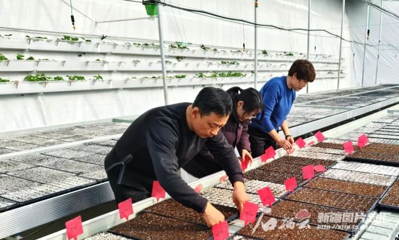 2月13日,尉犁县戈壁设施农业产业园大棚内,尉犁县林业和草原局高级工程师马娟(右一)和同事在点种太空罗布麻种子。尉犁县林业和草原局供图