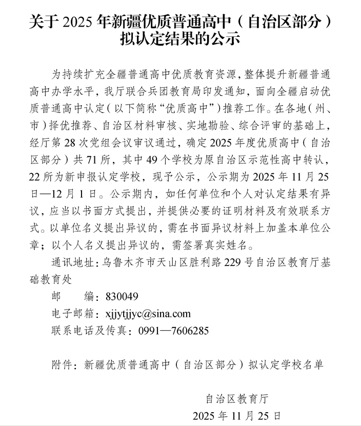 11月25日,新疆维吾尔自治区教育厅网站公布了《关于2025年新疆优质普通高中(自治区部分)拟认定结果的公示》,其中,巴州转认4所(巴州第二中学、库尔勒市第四中学、和静高级中学、焉耆县第一中学)、新申报认定学校2所(库尔勒市第三中学、尉犁县第一中学)。
