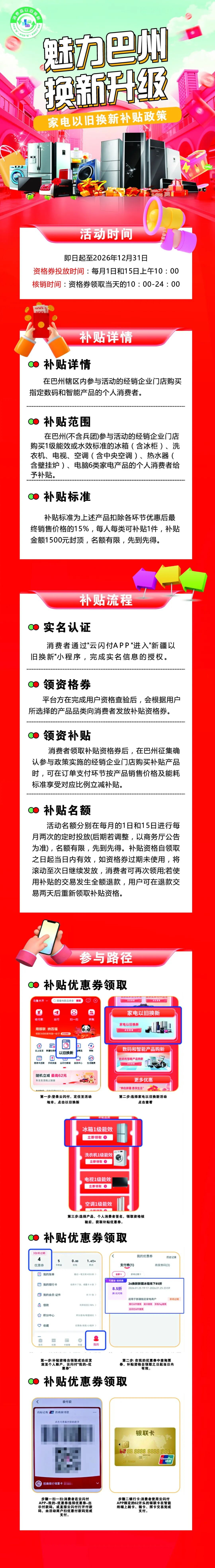 个人消费者在巴州辖区内(不含兵团)参与活动的经营主体购买补贴范围内产品,补贴标准为产品扣除各环节优惠后最终销售价格的15%。每人每类可补贴1件,每件补贴金额不超过1500元。